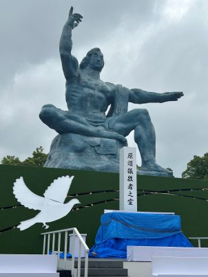 平和公園に着く頃には雨も弱まり、大きな平和祈念像が目に留まりました。この像は神の愛と仏の慈悲を象徴し、天を指した右手は「原爆の脅威」を、水平に伸ばした左手は「平和」を、軽く閉じた瞼は「原爆犠牲者の冥福を祈る」という想いが込められているそうです。また平和記念像の前方には平和の泉もありました。この泉は「水を、水を」と呻き叫びながら亡くなった被爆者たちの痛ましい霊に水を捧げて冥福を祈り、世界恒久平和と核兵器廃絶の願いを込めて建設されたそうです。